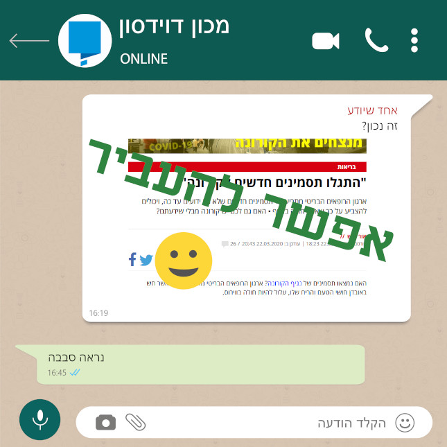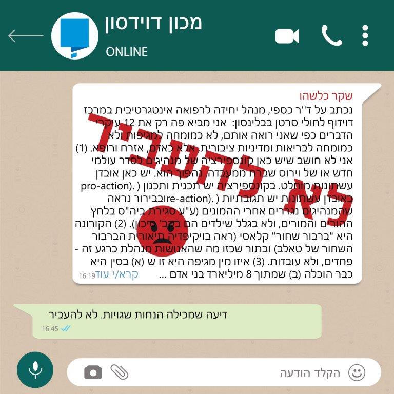 מסתובבות ברשת כמה גרסאות של "הודעת בילינסון". פעם זה מרופא, פעם מאחות, פעם מחבר שעובד בבית החולים. ובהודעה יש הרבה אי דיוקים. האתר לא רלוונטי – הדף הרשמי פנה לדוברות בית החולים בילינסון, שמסר בתגובה שזו איננה הודעה רשמית שלהם ושאין להסתמך עליה. חלק מהדברים שכתובים נכונים וחלקם לא. חולים מעל גיל 80 אכן נמצאים בסיכון גבוה יותר למות מהמחלה, במיוחד אם יש להם מחלות רקע, אך לא נכון לומר שרובם ימותו. בסין 14.8 אחוז מהחולים מעל גיל 80 מתו מהמחלה, שזה אכן שיעור גבוה אבל רחוק מלהיות רוב. המחלה לא דומה לשפעת, שכן מדובר בנגיף שונה שגורם למחלה אחרת שחלק מתסמיניה דומים. ייתכן שהעברה ממשטחים נגועים איננה צורת ההדבקה העיקרית, אך היא אחת מצורות ההדבקה האפשריות ולכן חשוב להקפיד לשטוף ידיים. חולה שאינו מראה תסמינים עדיין עלול להיות מדבק, ולא כדאי לזלזל בזה. ככלל, מידע על המחלה מוטב לקבל ממקורות רפואיים מוסמכים ולא מהודעות אלמוניות בווטסאפ.