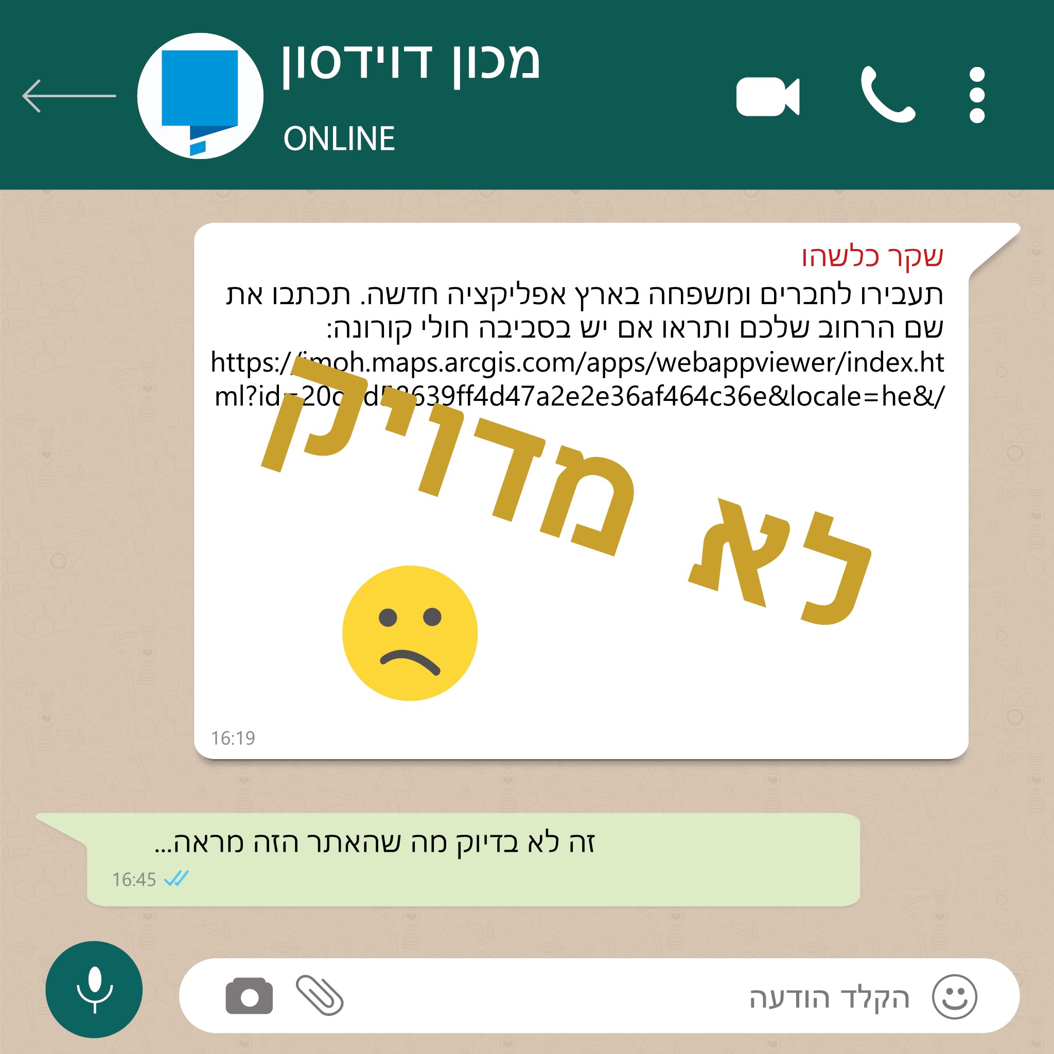 ההודעה הזאת רצה כבר כמה ימים בווטסאפ ומזמינה אנשים לבדוק אם יש אנשים חולים בסביבתם. הקישור בהודעה מוביל למפה אינטראקטיבית של משרד הבריאות, שמתארת מקומות שבהם שהו אנשים שאובחנו כחולי קורונה והמועדים שבהם זה קרה, על מנת לעזור לאנשים לדעת אם הם אמורים להיות בבידוד. בקיצור, אפשר להעביר את הקישור – אבל ההסבר לא מתאר את מה שיש בו באמת.