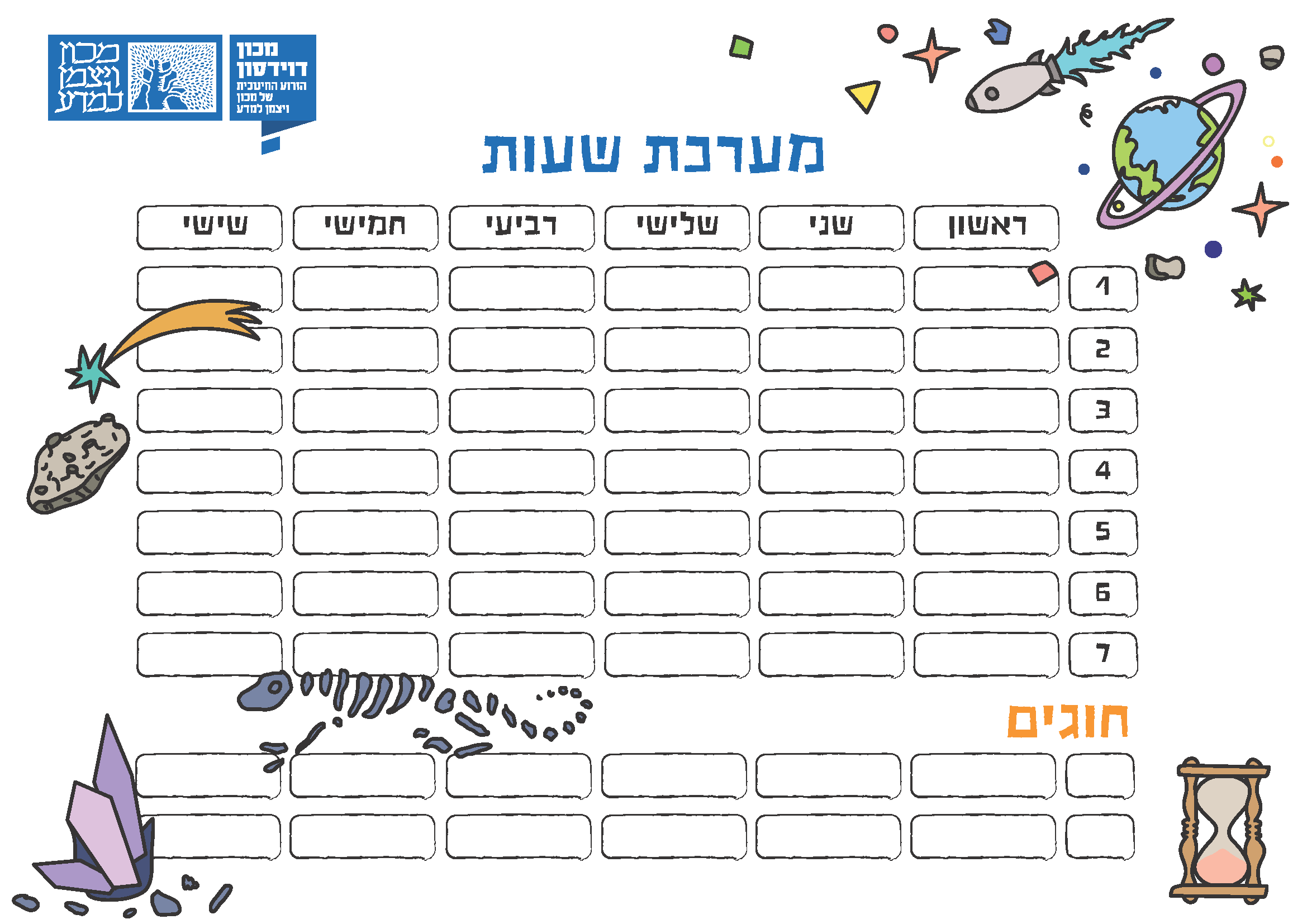 ראשי לקרוא ולצפות מדע לילדים מערכת שעות מדע לילדים מערכת שעות מכון דוידסון שמח להגיש לכל הילדים והילדות מערכת שעות להדפסה מערכת דוידסון מערכת דוידסון שתף הקישור הועתק! 5 אוקטובר 2021 | 1 דקות | Getting your Trinity Audio player ready... עכשיו שהחגים נגמרו ובאמת מתחילה שנת לימודים החדשה, שבתקווה תהיה ברובה פרונטלית, מכון דוידסון שמח להגיש לכל הילדים והילדות מערכת שעות להדפסה. תהנו ובהצלחה בלימודים 🙂 תכנים נוספים עבורך מדע לילדים חלל הפעל וידאו זהירות: יש בשמיים חורים שחורים! מה זה בעצם חור שחור? איך הוא נוצר ואיך הוא משפיע על סביבתו? בואו נגלה! ד"ר דוד פולישוק 11.12.2022 1 דקות שטיפת מוח ידע כללי שטיפת מוח ג’וניור – איברים מתחדשים ובעלי חיים זוהרים איברים מתחדשים ובעלי חיים זוהרים – בואו לבדוק מה אתם יודעים? אלכס אברוטין 17.5.2025 1 דקות מדע לילדים מתמטיקה ומדעי המחשב חפשו את המטמון פעילות למשפחה פעילות להורים ולילדים בנושאי הצפנה: כמה מהר תצליחו לפתור את כל הצפנים? ד"ר יובל רוזנברג 10.10.2023 2 דקות