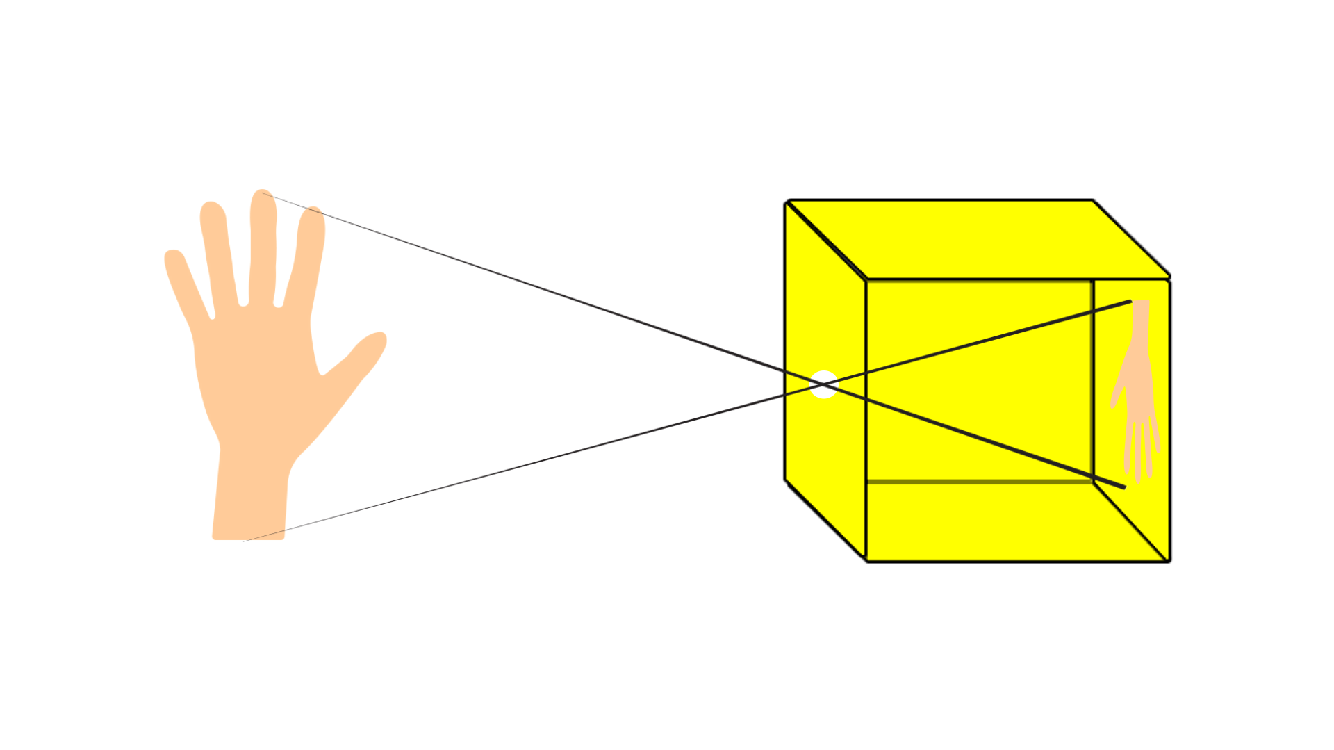 לכן, אם מול המצלמה ניצב חפץ מואר, קרני האור שיוצאות ממנו עוברות דרך הנקב וממשיכות משם בקו ישר עד שהן פוגעות בנקודה בודדת על המסך שפרסנו על הגליל הפנימי של המצלמה. מכל נקודה בחפץ יוצאת קרן אור אחת שעוברת דרך החריר ופוגעת במקום אחר במסך. אוסף רצף קרני האור הללו הוא מה שיוצר על המסך את ההעתק הדו-ממדי של החפץ. אולם כיוון שהאור נע בקווים ישרים, קרן אור שיוצאת מראש החפץ ועוברת דרך החריר פוגעת בחלק התחתון של המסך, וקרן אור שיוצאת מתחתית החפץ פוגעת בחלק העליון של המסך. התוצאה היא שהקרניים “מתהפכות” בדרכן מהחפץ למסך דרך החריר, (ימין-שמאל ולמעלה-למטה) והדמות שמתקבלת יוצאת הפוכה: