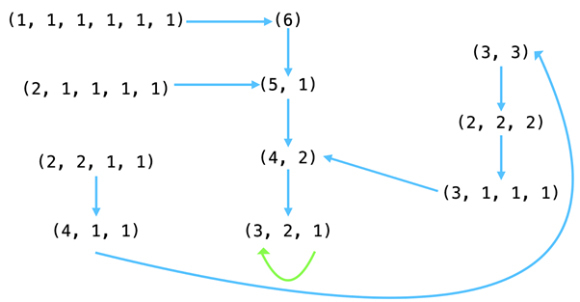 את המספר 6 אפשר לחלק 11 חלוקות שונות. בתרשים למטה אפשר לראות את המסלול שנעבור אם נתחיל מכל אחת מהחלוקות האפשריות של 6. רואים שכשמגיעים ל-(3,2,1) נתקעים שם, ושתמיד נגיע ל-(3,2,1) מכל חלוקה שבה נתחיל.