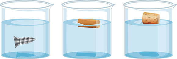 חוק ארכימדס קובע כי חומרים עם צפיפות נמוכה יצופו על פני חומרים עם צפיפות גבוהה. הצפיפות של שעם (מימין) נמוכה מזו של מים, ולכן הוא צף על פניהם. הצפיפות של עץ (באמצע) גבוהה קצת יותר, לכן הוא שוקע בחלקו אך נשאר על פני המים, והצפיפות של המסמר העשוי מתכת גבוהה מספיק בשביל שהוא ישקע לחלוטין במים | Shutterstock, Illustrator76