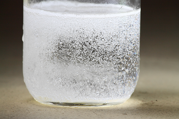 הגז שמבעבע בכוס הוא הגז פחמן דו-חמצני, שנוצר בתגובה כימית בין אבקת הסודה לשתייה לחומץ. כוס עם בועות שנוצרו בתגובה כזו | Shutterstock, JPBC