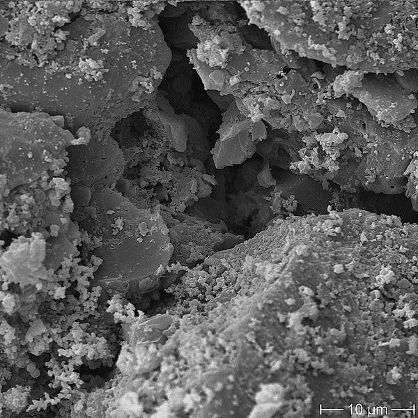 מבנה הנקבוביות והסדקים של פחם פעיל מבעד לעדשת המיקרוסקופ | צילום: Mydriatic ויקיפדיה