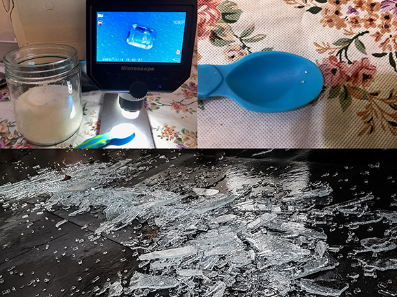 התופעה הזו נראית סביבכם כל יום. למעלה: גרגיר סוכר בודד נראה שקוף, גם בהגדלה, אולם כאשר הרבה גרגרי סוכר נמצאים יחד הם נראים לבנים, עקב תופעה של פיזור אור. למטה: גם שברי זכוכית שקופה נראים לבנים כאשר הם בערמה, כמו טיפות מים בענן | צילומים: אבי סאייג, שאטרסטוק