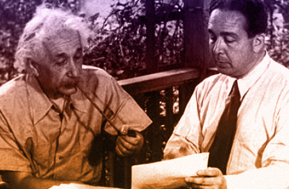 התחרט בדיעבד. איינשטיין (משמאל) וסילארד משחזרים את כתיבת המכתב המקורי | צילום מ-1946