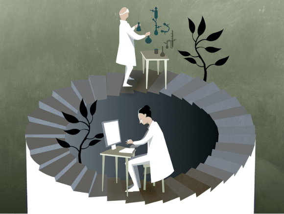 כימאים בימינו עורכים ניסויים באמצעות המחשב לא פחות מאשר במעבדה. התיאוריה והניסוי מפרים זה את זה. כימאים במעבדה ומול מחשב | Johan Jarnestad/The Royal Swedish Academy of Sciences