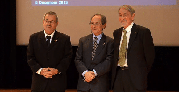 שלושת זוכי הנובל לאחר הרצאות הנובל באוניברסיטת סטוקהולם ב-2013. מימין לשמאל: מרטין קרפלוס, מייקל לוין, אריה ורשל | Nobel Media AB 2013
