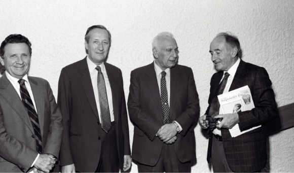 נכנס לנעליים גדולות. איזנברג (משמאל) עם בנו הס, אפרים קציר והיינץ שטאב בהרצאה השנתית לזכר אהרן קציר במכון ויצמן למדע, 1986 | מקור: ארכיון מכון ויצמן למדע