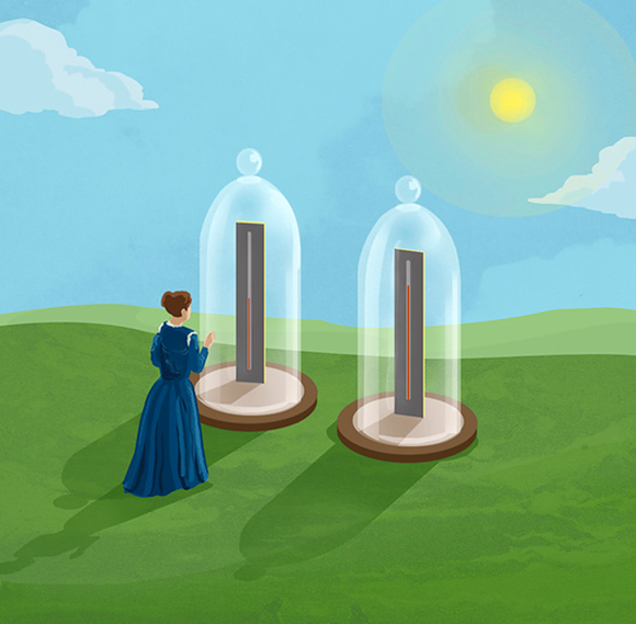 מילאה גלילי זכוכית בגז או בתערובת גזים, הניחה בשמש ובדקה את קצב עליית הטמפרטורה בתוכם. ניוטון-פוט במהלך הניסוי | איור: Sam Falconer, Debut Art / Science Photo Library