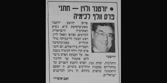 עטור פרסים. ידיעה מהעיתון "חדשות" על זכייתם של יורטנר ולוין בפרס וולף, ינואר 1988