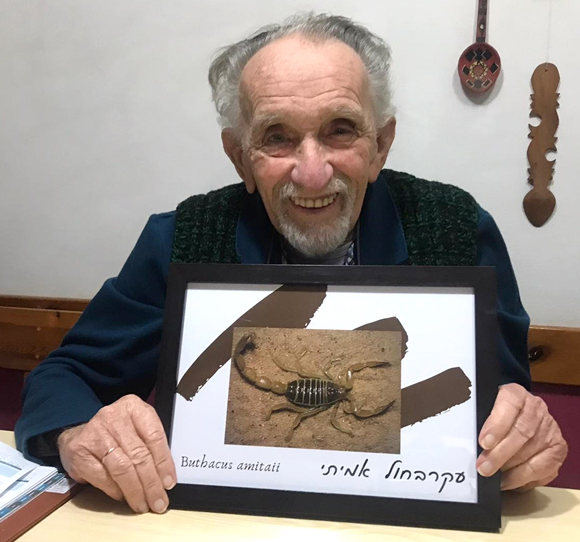 הצטיין באהבה לפרוקי רגליים ובתשוקה עזה לחינוך. פנחס אמִתַּי עם צילום של עקרב שנקרא על שמו | צילום: נתנאל דוולצקי, ויקיפדיה