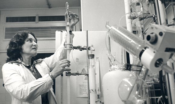 ממשיכה להגיע כל יום למשרד. ארנון במעבדה במכון ויצמן, 1960 | צילום: מכון ויצמן למדע