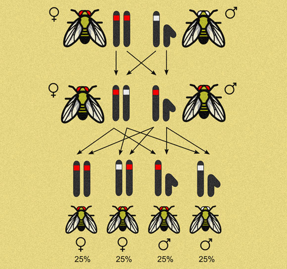 התיאוריה הכרומוזומלית של התורשה מסבירה כיצד מורגן קיבל את התוצאות המפתיעות בניסויי ההכלאה שלו. הניסוי מתחיל בהכלאת זכרים בעלי עיניים לבנות עם נקבות בעלות עיניים אדומות (רגילות). בדור הראשון לכל הצאצאים עיניים אדומות. אך בדור השני, משום שהגן לצבע העיניים מצוי על כרומוזום X, מחצית מהצאצאים הזכרים הם בעלי עיניים לבנות, ואף לא אחת מהנקבות. איור|גל מנלה