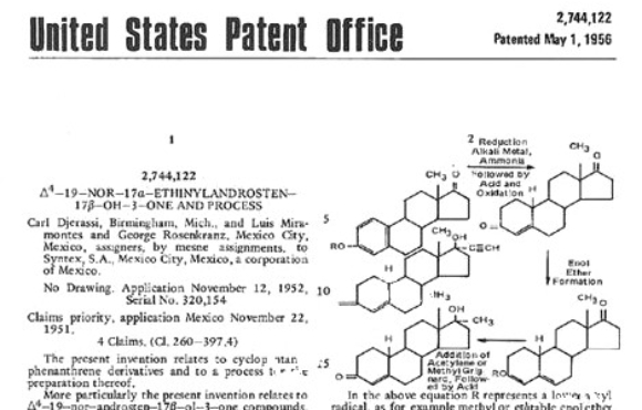 מולקולה שחוללה מהפכה. בקשת רישום הפטנט של ג’ראסי ועמיתיו על פיתוח הנוראתינודרון, נגזרת הפרוגסטרון היציבה הראשונה. לחצו כאן לקובץ המלא | מקור: ויקיפדיה, נחלת הכלל