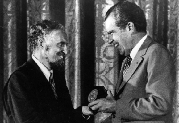 זכה באותות כבוד, עיטורים ופרסים רבים. ג’ראסי (משמאל) מקבל את המדליה הלאומית למדעים מנשיא ארצות הברית, ריצ’רד ניקסון, 1973 | מתוך מאמר לכבוד יום הולדתו ה-90