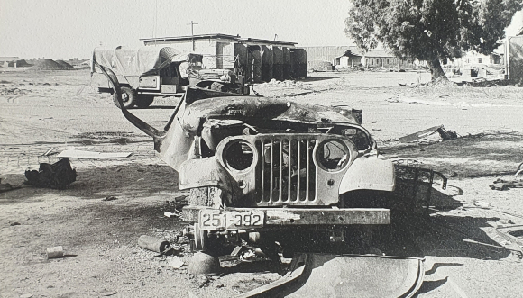 פגיעה ישירה בחלק הקדמי. הג'יפ שבו נהרג אלכסנדר וולברג, חלקיו עדיין מפוזרים סביבו | צילום: יהושע מסינג, באדיבות משפחת וולברג