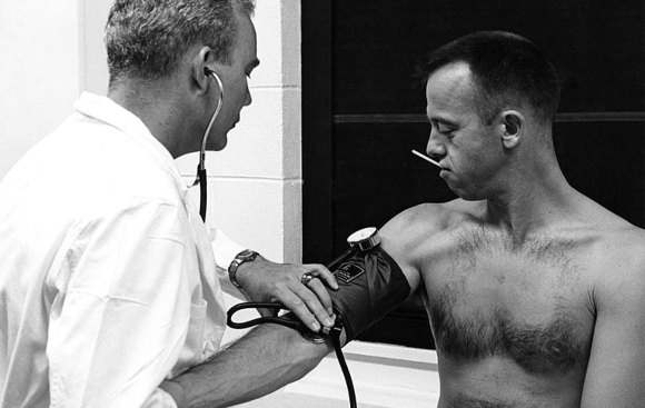 בוררים מתוך קבוצת עילית. ברי בבדיקה רפואית של האסטרונאוט ג’ים מקדיוויט, לקראת משימת ג’מיני 4 | צילום: NASA