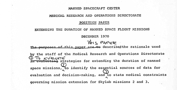 מחקר מבוסס נתונים. נייר עמדה של ברי מ-1970 בנוגע לשהות ממושכת בחלל, לקראת תכנון המשימות לתחנת החלל האמריקאית סקיילאב | מקור: ארכיון צ’רלס ברי, אוניברסיטת טקסס