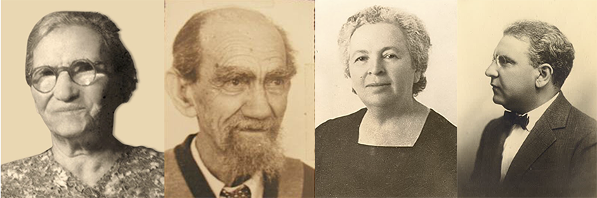 סביו וסבותיו משני הצדדים נמנו עם 66 המשפחות שייסדו את תל אביב בשנת 1909. מימין לשמאל: חיים הררי, יהודית הררי, אבא נאמן ושרה לבית מושלי | ויקימדיה, נחלת הכלל
