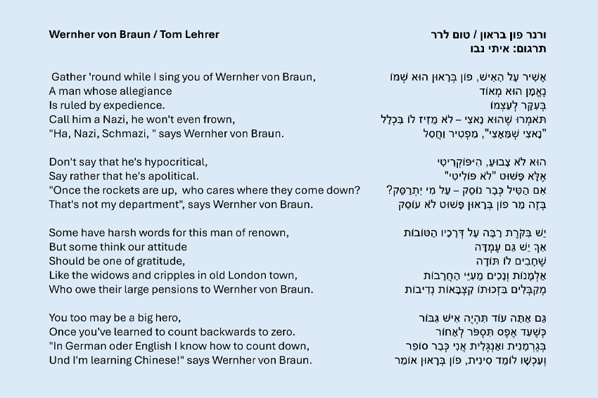 לרר כתב שירים סאטיריים, ביניהם השיר הזה על מדען הטילים הגרמני פון בראון. תרגום: איתי נבו