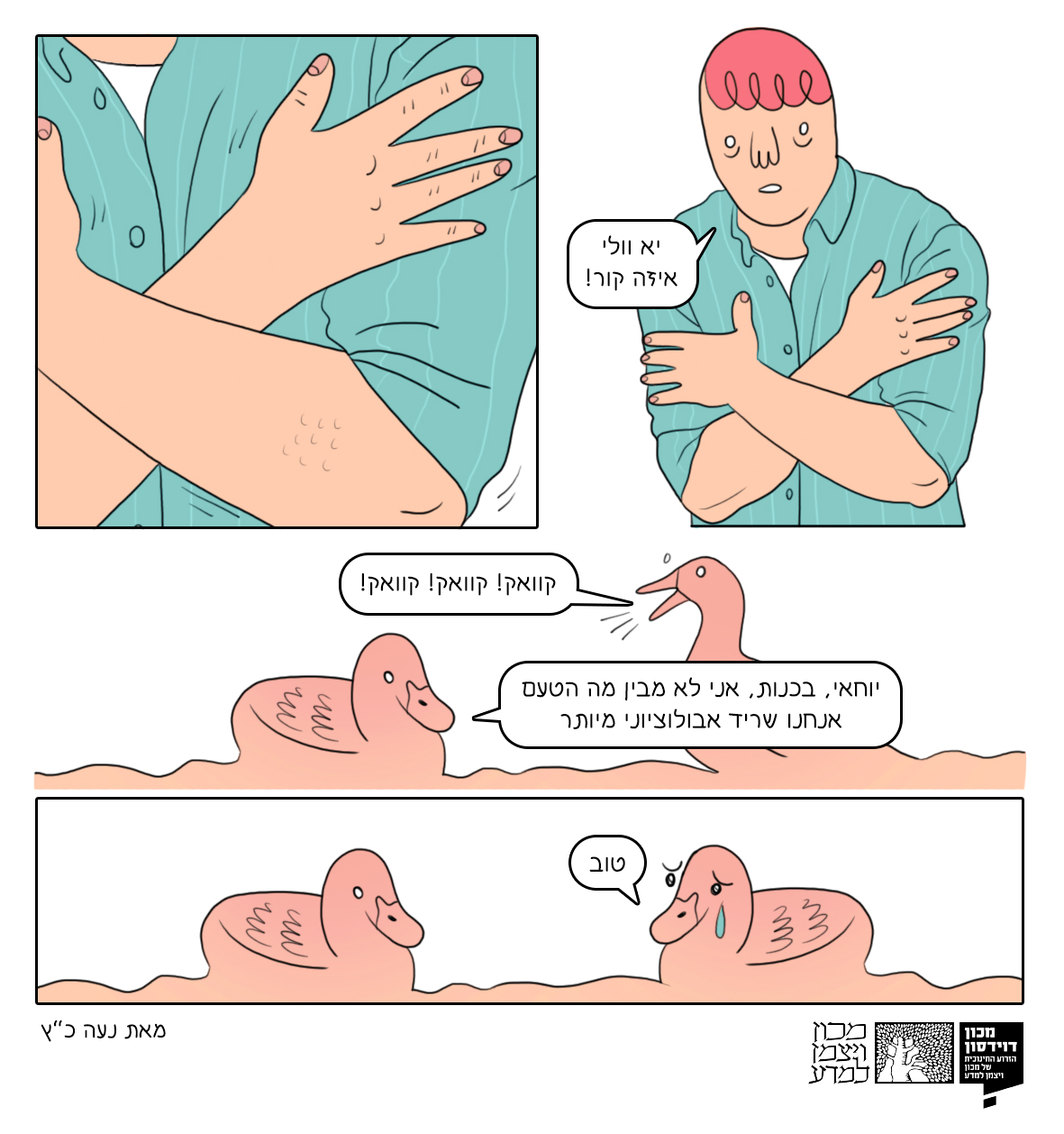 אובדן הפרווה אצל בני האדם הטריד את דרווין, הוא לא הצליח להבין מה ‘ההיגיון האבולוציוני’ בכך? (אני מניח שהעובדה שחי בבריטניה הקרה והגשומה הוסיפה לפליאה שלו על יתרון באובדן פרווה). במהלך השנים הועלו השערות שונות המנסות להסביר זאת – כמו למשל שללא פרווה הרבה יותר קל להילחם בכינים, פשפשים ושאר טפילי עור. כיוון שמדובר בבני אדם, אי אפשר לפסול גם סיבות כמו העדפות אסתטיות שנתנו לחוסר פרווה יתרון. תהייה הסיבה אשר תהייה – אנו חסרי פרווה שאפשר לסמור בעוד חיות רבות הן בעלות פרווה המאפשרת להן הגנה טובה בהרבה מפני הקור. באנימציה בסרטון בחרתי דווקא בשועל כדי להדגיש את העיקרון האבולוציוני המהפכני, שכל היצורים החיים הם למעשה צאצאי אב קדמון משותף, אם הולכים מספיק אחורה. כלומר לא רק לנו ולקופים, גם לנו ולשועלים ולמעשה – אפילו לבננה ולבני האדם יש אב קדמון משותף!