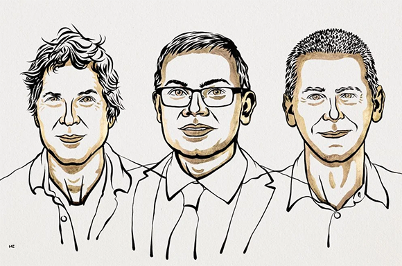מחקריהם עוסקים בחיזוי המבנה המרחבי של חלבונים ובתכנון חלבונים בעלי מבנה מסוים. מימין לשמאל: ג’מפר, הסביס ובייקר | Ill. Niklas Elmehed © Nobel Prize Outreach