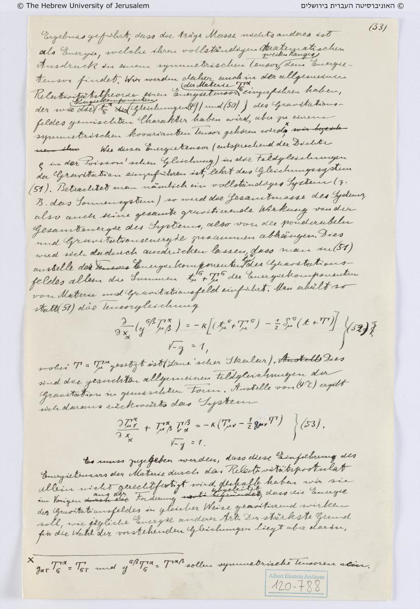 קטע מהחישובים של איינשטיין על גלים כבידתיים | צילום: האוניברסיטה העברית בירושלים
