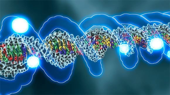 קיימים גם תהליכי בקרה שמשפיעים על תכונות התאים בלי לשנות את רצף ה-DNA. בתמונה מסומנים שינויים אפיגנטיים כאלו כנקודות בהירות על פני ה-DNA | מקור: Equinox Graphics, Science Photo Library