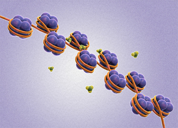 תהליך המתילציה בא לידי ביטוי בהוספת קבוצת מתיל, במקומות נבחרים על מולקולת ה-DNA. מולקולת DNA (בכתום) ארוזה סביב חלבונים (בסגול), וקבוצות מתיל בירוק נצמדות אליה | Gunilla Elam, Science Photo Library