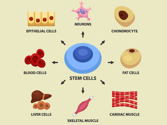 כל התאים בגוף נוצרים מתאי גזע עובריים, שהופכים לתאי גזע של רקמה ספציפית ובהמשך מאמצים את התכונות הסופיות של תא מסוג ספציפי ברקמה. אילוסטרציה של התמיינות תאים לסוגים שונים | Shutterstock, stscheb