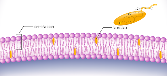 הליפידים שמרכיבים את קרום התא מתארגנים בשכבה כפולה: הראש (נראה בתמונה כעיגול) פונה כלפי חוץ התא או פנים התא, והרגליים פונות זו כלפי זו כדי להימנע ממגע עם המים שמחוץ לתא ובתוכו. אילוסטרציה של מבנה קרום התא, עם כולסטרול | Shutterstock, Alfa MD