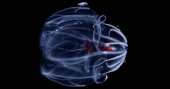 ליפידים של מסרקנית מהים העמוק בלחץ נמוך של באר אחד התארגנו במבנים דמויי צינורות במקום ליצור קרום תא. מסרקנית מהסוג Bathocyroe שחיה בלחץ גבוה | Courtesy of the Lyman group and Jacob Winnikoff/UC San Diego
