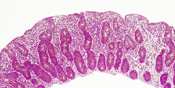 חשיפה לחלבון גלוטן בתזונה גורמת להיווצרות דלקת ברירית המעי. קטע מן המעי הדק של חולה צליאק | מקור: Biophoto Associates / Science Photo Library