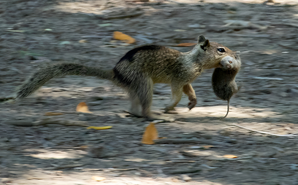 סנאים מהמין סנאי קרקע קליפורני צדים נברנים ואוכלים את בשרם. סנאי עם נברן מת בפיו | Sonja Wild/UC Davis