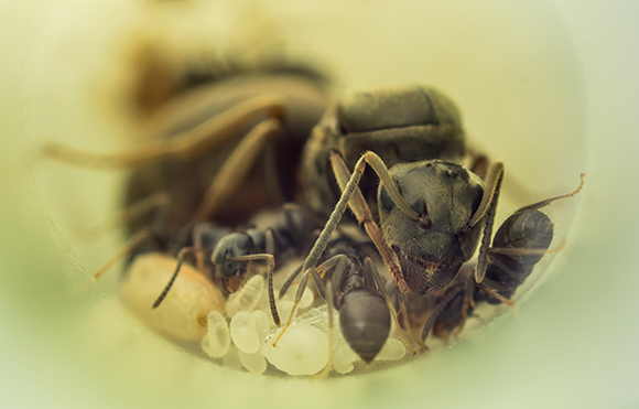 משנה את הארגון החברתי ואת מבנה הקן בתגובה לחשיפה למחלה. נמלת גינה שחורה לצד ביצים, זחלים, גלמים ומלכה | Nik Bruining, Shutterstock