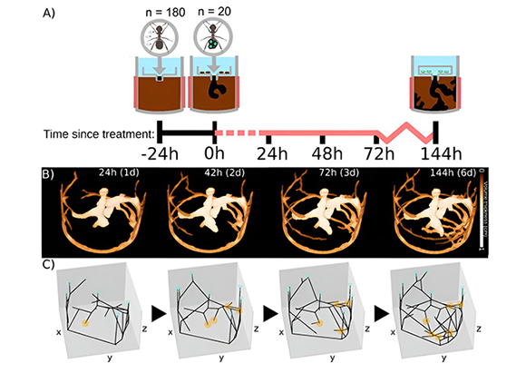שורה עליונה: מושבה של 180 נמלים שהוספו לה 20 נמלים; מרכז: מבנה פנימי של הקינים בסריקת CT; שורה תחתונה: מודלים תלת-ממדיים שהופקו מהסריקות. פרוטוקול הניסוי | מתוך Leckie et al.