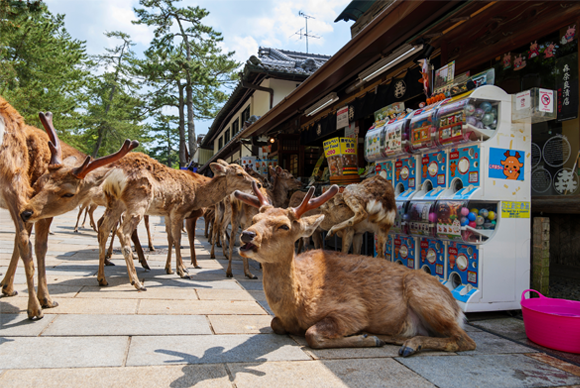 החוקרים אספו נתונים מ-76 מחקרים על 2,300 בעלי חיים שהשתייכו ל-43 מיני יונקים, ובדקו את דפוסי התנועה שלהם בזמן הסגר. צבאים מסתובבים לצד חנויות מזכרות סגורות ביפן, במאי 2020 | Shutterstock, worldlandscape