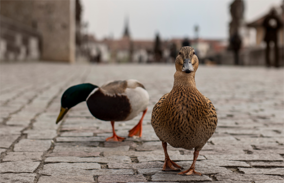 בעלי החיים הרגישו חופשיים יותר להרחיק למקומות שלפני כן לא יכלו להגיע אליהם בגלל נוכחות האדם. ברווזים על גשר קרל בפראג, צ'כיה, המלא תיירים בימים רגילים, בזמן הסגרים של 2020 | Shutterstock, Zuk TM