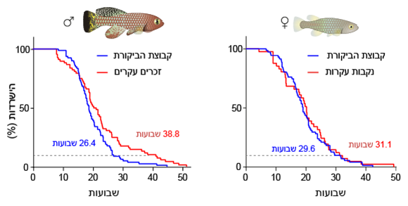 הגרפים מראים את אחוז הדגים ששרדו בכל שבוע שחלף בדגים ללא תאי מין (באדום) או בקבוצת הביקורת (כחול). בצד שמאל מוצגים אחוזי ההישרדות של הזכרים, ומימין – של הנקבות. תורגם מתוך המאמר המקורי
