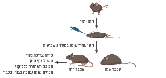 העכברים טופלו בטפטוף של חיידקים המפרישים הורמונים מווסתי־תיאבון וסופק להם מזון עתיר שומן. התוצאה: העכברים המטופלים עלו פחות במשקל בהשוואה לעכברי הביקורת | עיצוב: ליאת פלי, מתוך Shen et al