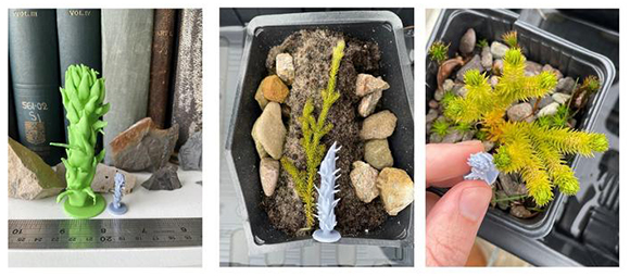 החוקרים הרכיבו מודל תלת-ממדי של הצמחים, ומצאו שהעלים שלהם צמחו בספירלות אחרות, ולא לפי סדרת פיבונאצ'י. הדפסות תלת ממד של הצמחים ליד צמחים מודרניים | Dr Sandy Hetherington