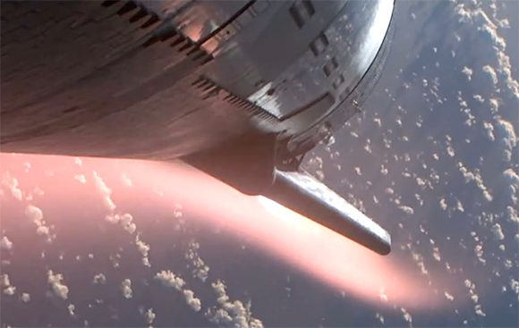 מתמקדים באתגר הכניסה לאטמוספרה. הילה של פלזמה נראית בבירור סמוך למגן החום בעת כניסת החללית לאטמוספרה בניסוי הקודם, לפני שהיא נשרפה | צילום: SpaceX
