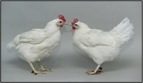 הטיפול יעיל במניעת הדבקה, לפחות בריכוזים נמוכים, ולא משפיע לרעה על בריאות התרנגולות. תרנגולת מהונדסת גנטית (מימין) לצד תרנגולת רגילה | מתוך מאמר המחקר