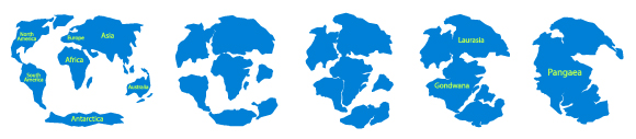 תפוצת המינים עדיין משקפת את תהליכי היווצרות היבשות. מיבשת העל פנגיאה (מימין), דרך כמה שלבי ביניים של התפרקות ונדידת יבשות, עד למצב הנוכחי (משמאל) | איור: tinkivinki, Shutterstock