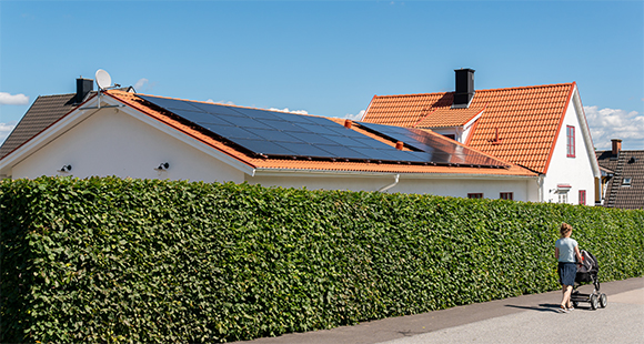 כשני שלישים מהאנרגיה הסולרית מיוצרת מלוחות המותקנים על גגות של בתים פרטיים ומבנים אחרים. בית עם לוחות סולריים על גג רעפים באירופה | צילום: Bezbod, Shutterstock