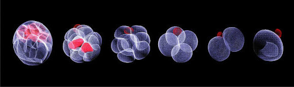לאחר ההפריה הביצית המופרית מתחלקת והופכת מתאים עם פוטנציאל התפתחותי בלתי מוגבל לתאים מתמחים יותר ויותר. השלבים הראשונים של התפתחות עובר עכבר | צילום: Dr M. Zernicka-Goetz, Gurdon Institute. CC0 1.0 Universal, via Wellcome Collection