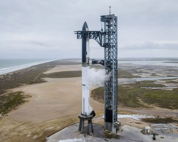 מגדל של 120 מטר. חללית סטארשיפ על גבי טיל סופר הבי באתר השיגור של ספייס-אקס בטקסס | צילום: SpaceX