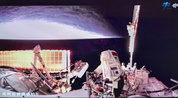 בינתיים הם מסתדרים בלי שיתוף הפעולה האירופי. שני אנשי צוות סינים בהליכת חלל מחוץ לתחנת טיאנגונג -3 בשנה שעברה | צילום: CMSA