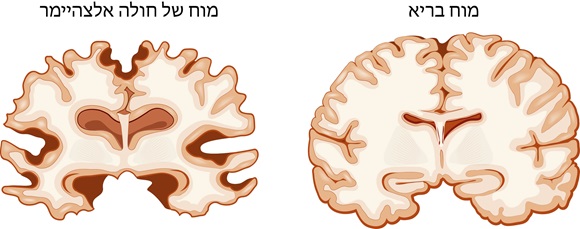 מחלת האלצהיימר היא השכיחה מבין המחלות הניווניות של המוח. מוח בריא (ימין) למוח של חולה אלצהיימר בשלבים מתקדמים של המחלה (שמאל) | תרשים: Designua, Shutterstock